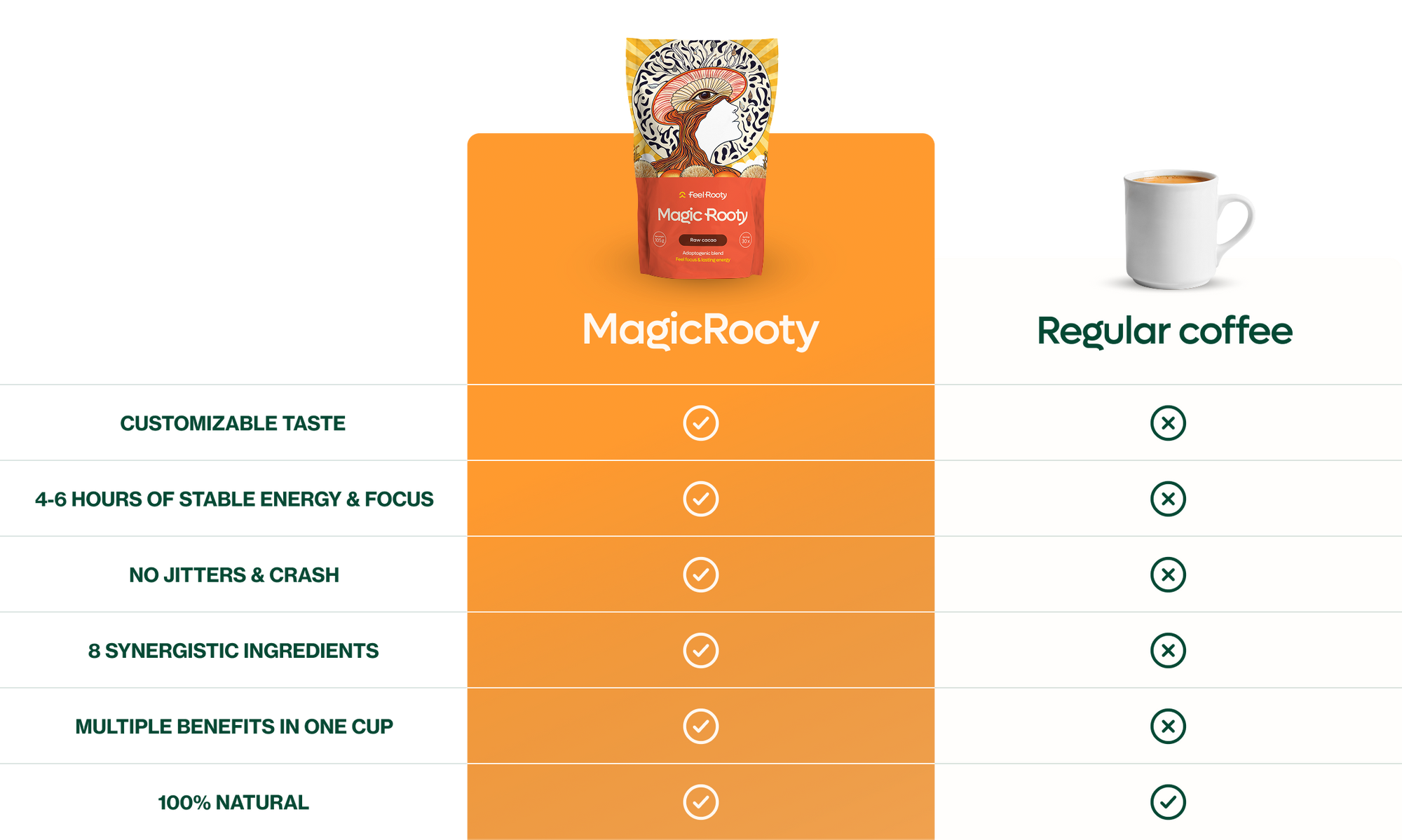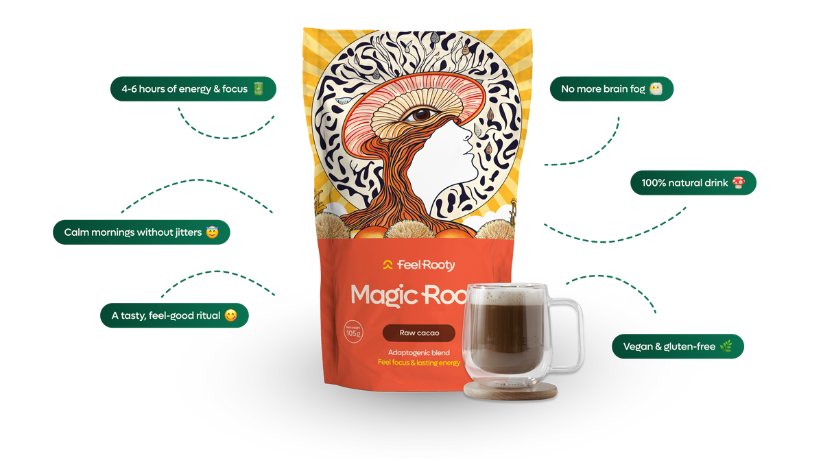 MagicRooty is your go-to coffee alternative for all-day energy and sharp focus. This tasty blend of superherbs and mushrooms is like a superhero in a cup. Make it part of your morning ritual and feel the magic of adaptogens and mushrooms.