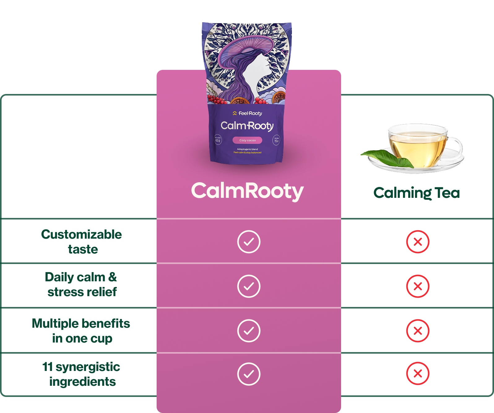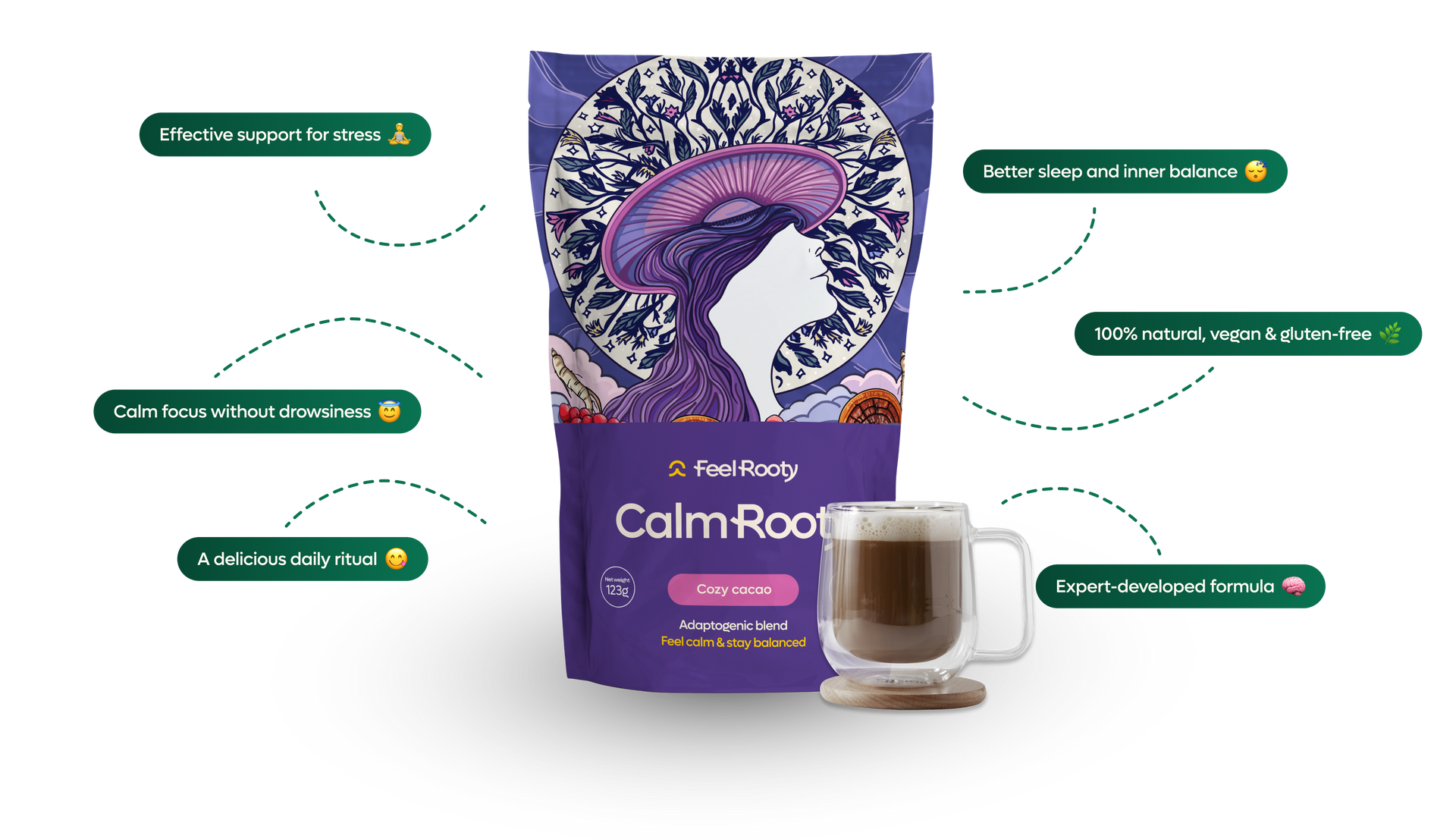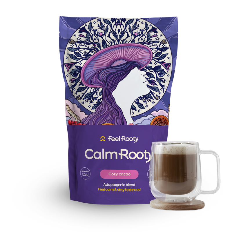 CalmRooty is a delicious blend of adaptogens, superfoods, and medicinal mushrooms - crafted to ease stress, calm your body, and restore balance.