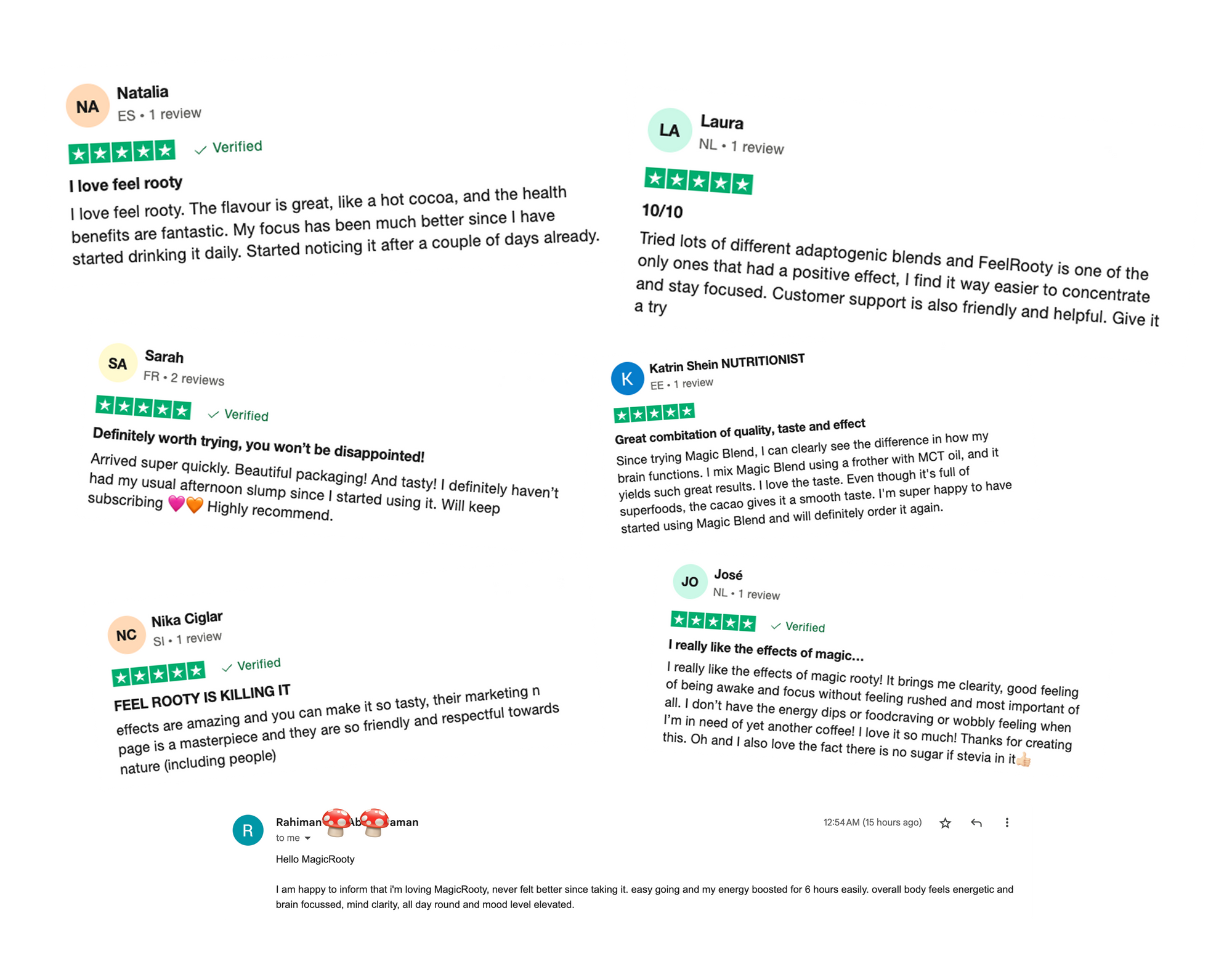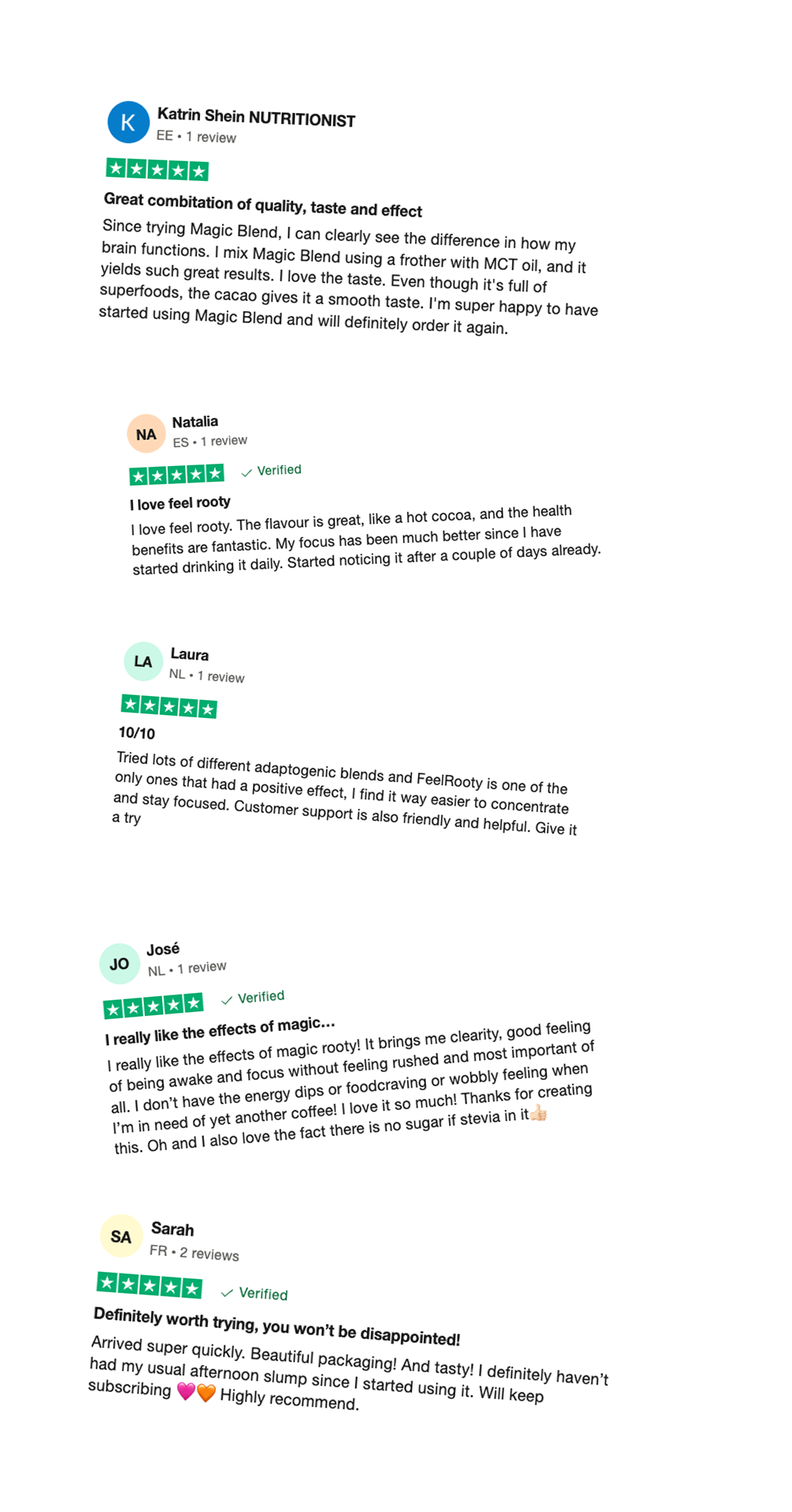 At FeelRooty, we only use the best of the best — mostly organically grown, sourced from regions where each plant thrives naturally, and carefully extracted for maximum effect. Backed by independent lab tests and blended in perfect synergy to support your well-being, every ingredient is here with purpose.